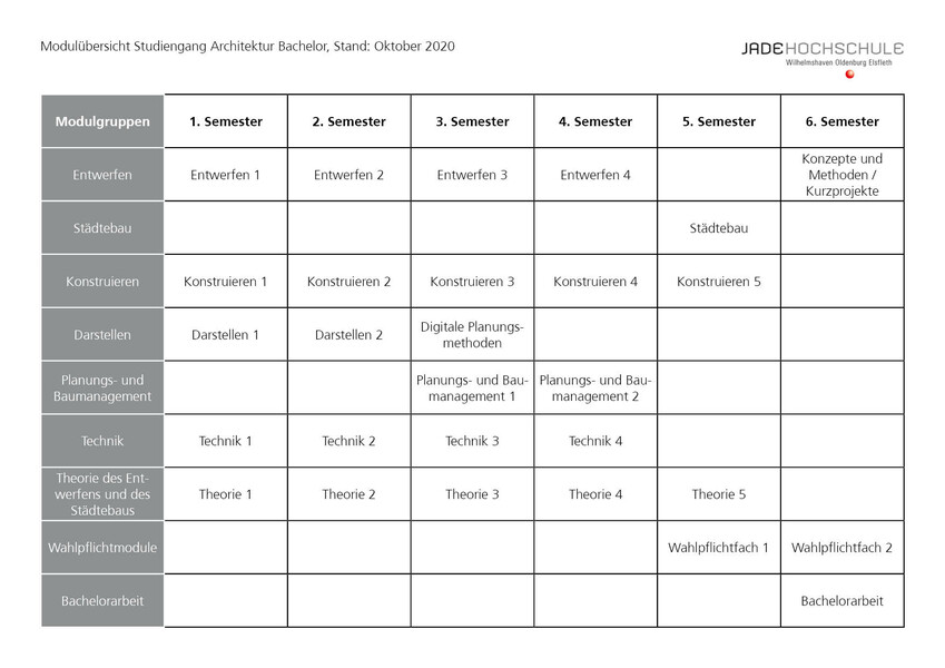 - Städtebau: Räumliche und qualitative Bezüge von Stadtteilen, Straßen und Plätzen werden im Fach Städtebau analysiert.